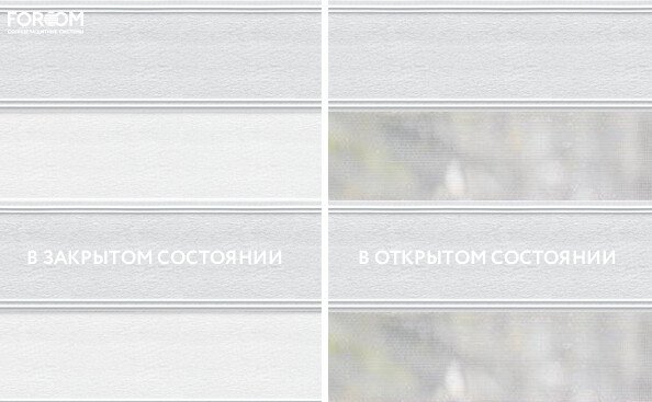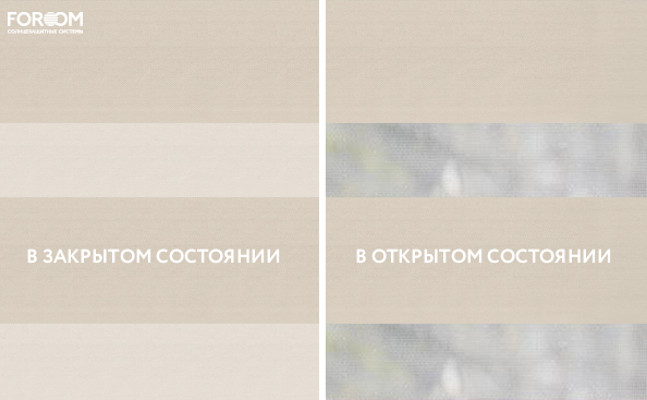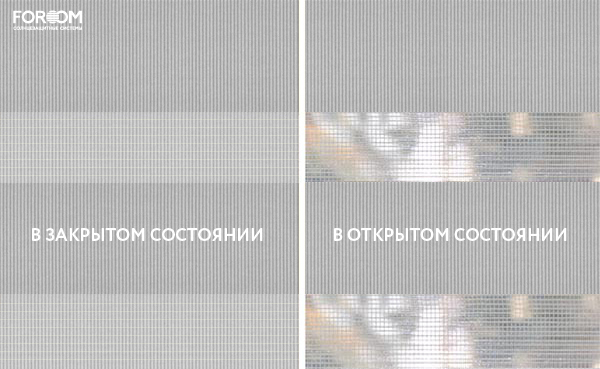 Полотно ткани, состоит из чередующихся горизонтальных полос – прозрачных и непрозрачных. Изменяя положение этих полос относительно друг другу, можно создать целых 3 режима регулировки светом. Например, чтобы в помещении стало светлее, нужно расположить прозрачные полосы друг напротив друга. Если разместить прозрачную и непрозрачную полосу параллельно друг другу, то можно добиться практически полного затемнения.